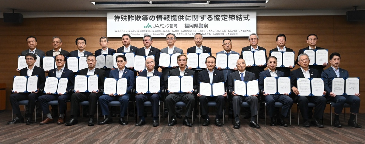 当協定は、特殊詐欺等の被害防止およびその犯人の検挙に向け、県内JAと福岡県警察が連携を強化し、県内一体となって貯金口座を通じて行われる金融犯罪被害を防止する取組みを行うことにより、JAバンク福岡の組合員等利用者の資産の保護および安心感の醸成を図るため締結を行ったものです。