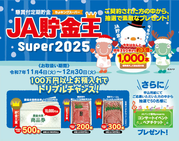 令和7年11月4日(火)~12月30日(火)の期間に懸賞付定期貯金「JA貯金王Super2025」をご契約いただいた方の中から、抽選で約1,000名様に素敵なプレゼントが当たります。