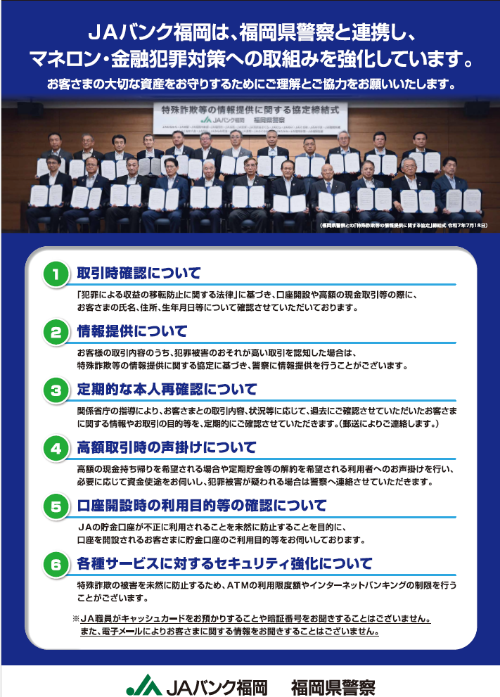 また、令和7年7月18日に福岡県警察と「特殊詐欺等の情報提供に関する協定」を締結し、特殊詐欺等(特殊詐欺、SNS型投資、ロマンス詐欺)の根絶に向けた社会の実現を目指し、犯罪行為から組合員等利用者の大切な資産を守るよう努めております。